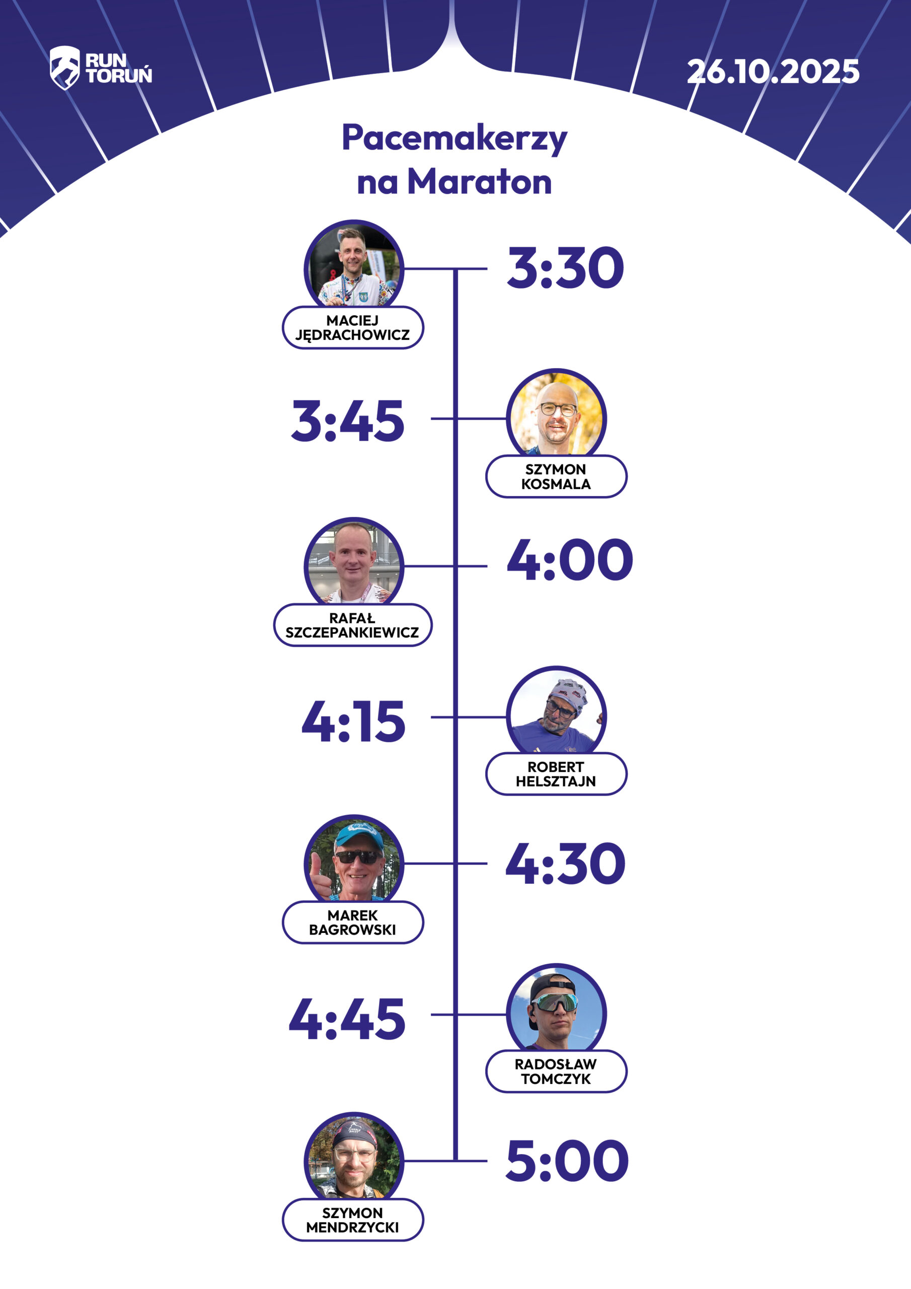 Podczas finałowej edycji Trylogii Toruńskich Legend nie będziecie sami na trasie! Do Waszej dyspozycji będą pacemakerzy, którzy pomogą Wam utrzymać równe tempo i osiągnąć wymarzony czas na mecie.